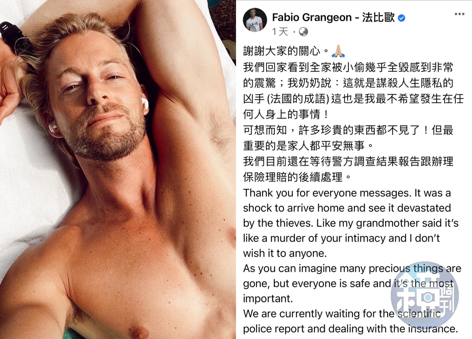 法比歐表示,「我們回家看到全家被小偷幾乎全毀感到非常的震驚,這也是我最不希望發生在任何人身上的事情!可想而知,許多珍貴的東西都不見了!但最重要的是家人都平安無事。」現在法比歐只能靜靜等待警方調查結果報告跟辦理保險理賠的後續處理,安慰自己財去人安樂。