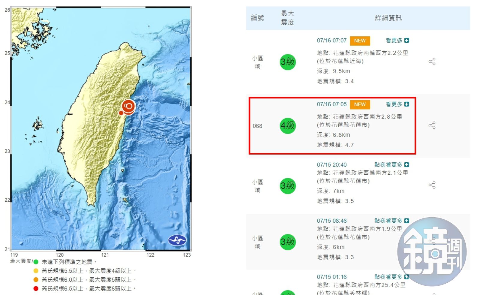 花蓮餘震不斷 7點5分規模4.7深度僅6.8公里