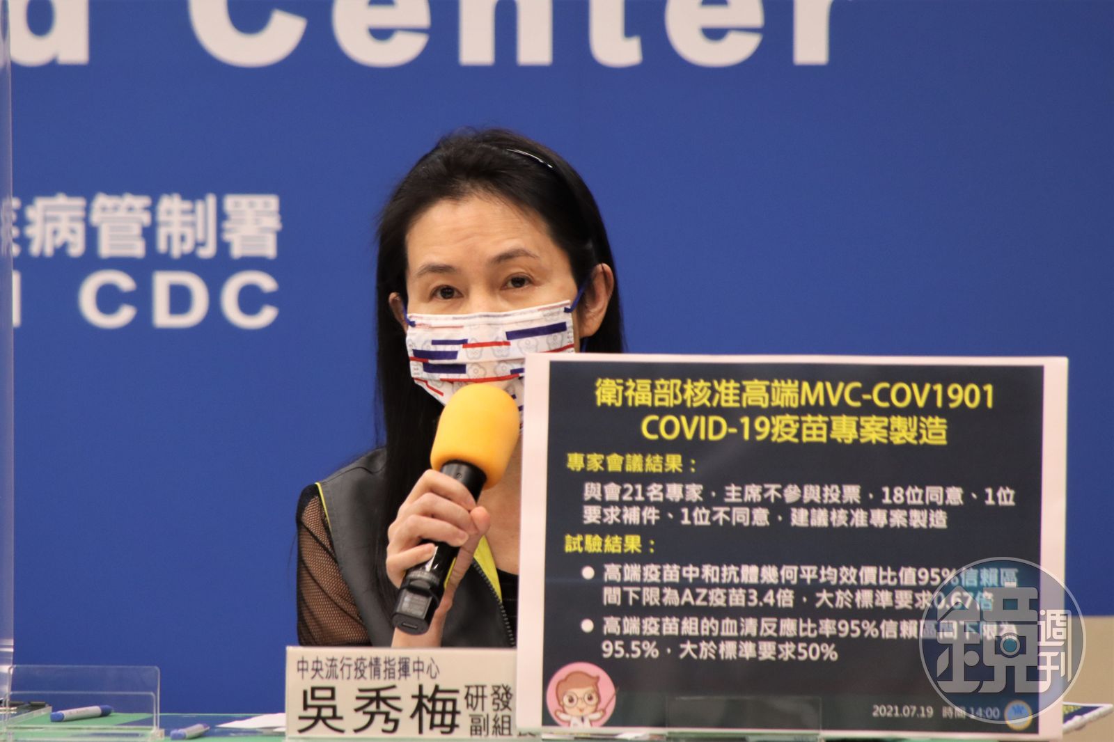 吳秀梅也補充表示,評估整體醫療利益與風險平衡,與會專家出席21人,主席不參與投票,18人同意,1人補件再議,1人不同意。食藥署依《藥事法》第48條之2規定,核准高端疫苗專案製造,適用於20歲以上成人之主動免疫接種,接種兩劑,間隔28天,以預防COVID-19。