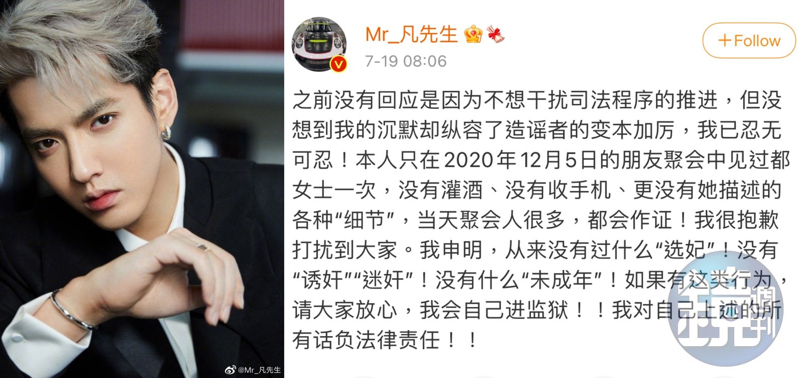 吳亦凡今早大動作駁斥都美竹的指控,除本人發誓若屬實將自己進監獄受法律制裁,其工作室發表聲明表示都美竹的言論已升級為針對吳亦凡的網路暴力,並說她偽造工作室微信、微博帳號,甚至聊天紀錄,將提起法律告訴。