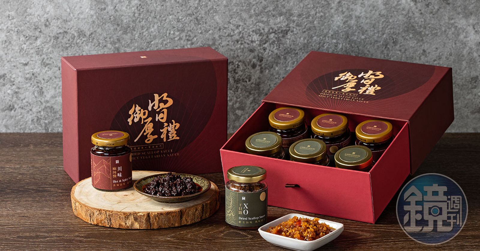 倍受饕客愛戴的國賓川菜廳,多年來以「三香三椒三料,七滋八味九雜」面面俱到地滿足了所有饕客味蕾,而思慮周全的主廚,也希望顧客在家偶爾想起國賓川菜滋味時,能一嘗麻辣香氣的千滋百味,因此才有這罐匯集各種滋味的「川味麻辣醬」,並決定與粵菜廳的「干貝XO醬」一起包裝成「國賓御醬厚禮」禮盒,以滿足饕客的一百種味蕾。