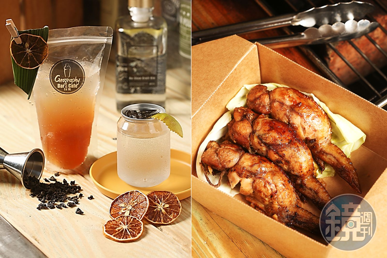 為了第一時間享用最佳風味,Pei(右)和店內夥伴(左)將Bar與餐檯融於一車,透過事先預約的方式不定點停靠,如同外送、又像是親臨現場。餐車抵達預約位置就開始製餐,完成前5分鐘會與客人聯繫,少了等待,多了臨場感。Geographytruckbar一半備餐,另一半餐車成為酒櫃,讓客人久違地看見調酒師技藝。主打現調現裝只為最新鮮沁涼的原始特調風味能夠即刻入口。Pei設計的餐酒搭,一個主餐有2種風味調酒可選搭,可以挑「互補」或「相似」來烘托或帶出口感上的反差萌,就連餐點名都是整套串聯不可分。像是「柚香蜜茶」中塞入自製肉漿的肥美烤雞翅,配對台灣馬告琴酒為基底的特調,爽利氣泡帶上柑橘香和些許刺辣,尾韻微苦卻與雞翅炭燒後的煙燻風味相互映襯。