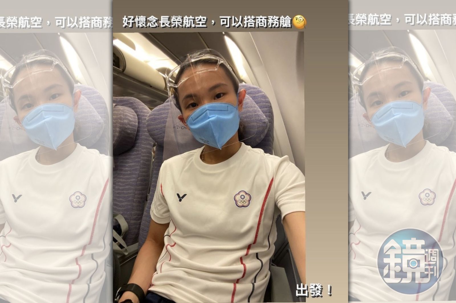 戴資穎在IG限時動態分享搭乘經濟艙的照片,透露自己「好想搭商務艙」的心情。(翻攝自戴資穎IG)發布時間:2021.07.20 11:05 臺北時間