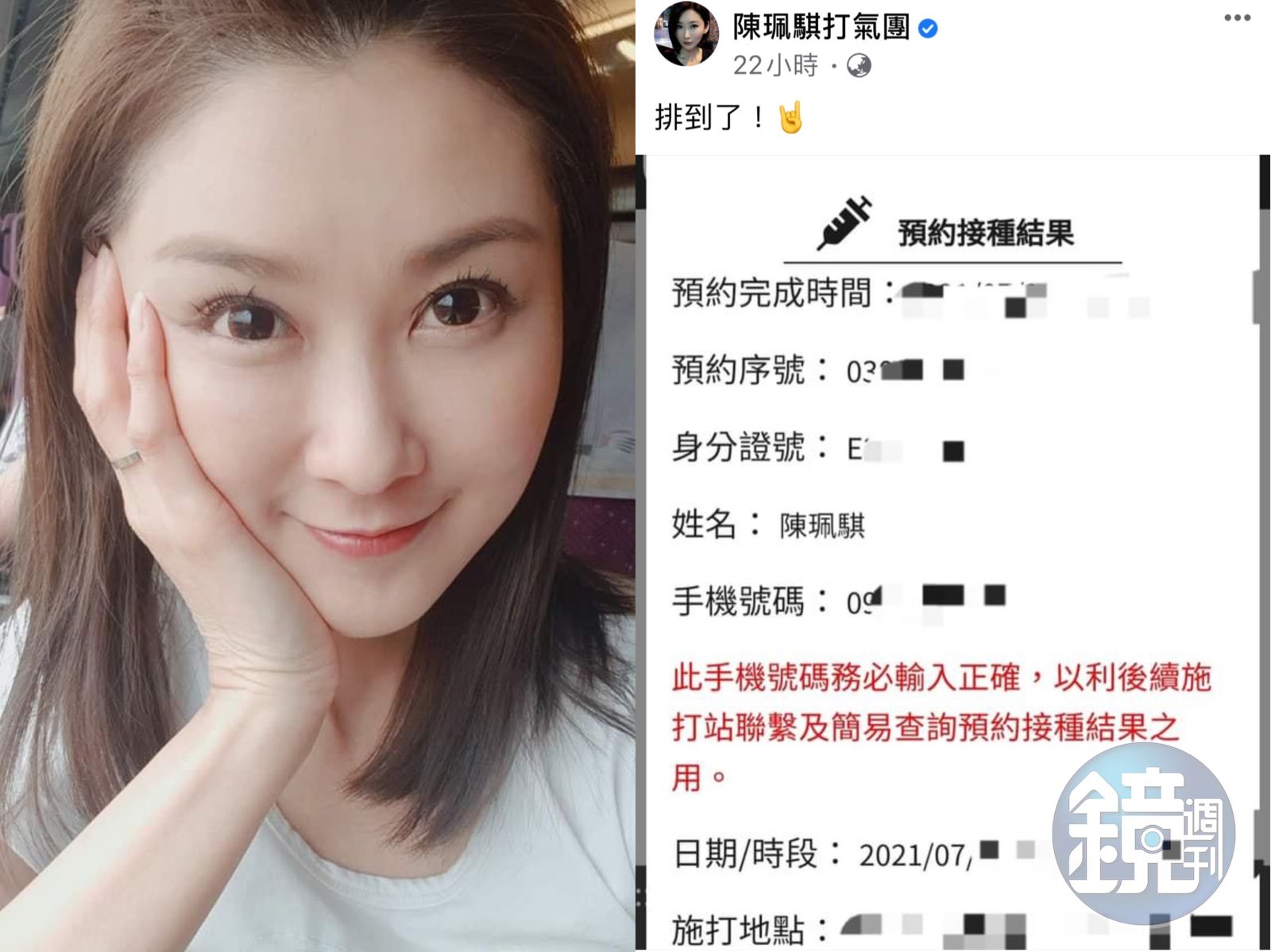 陳珮騏開心分享截圖表示自己成功預約施打疫苗。(翻攝自陳佩琪臉書)發布時間:2021.07.21 13:08 臺北時間