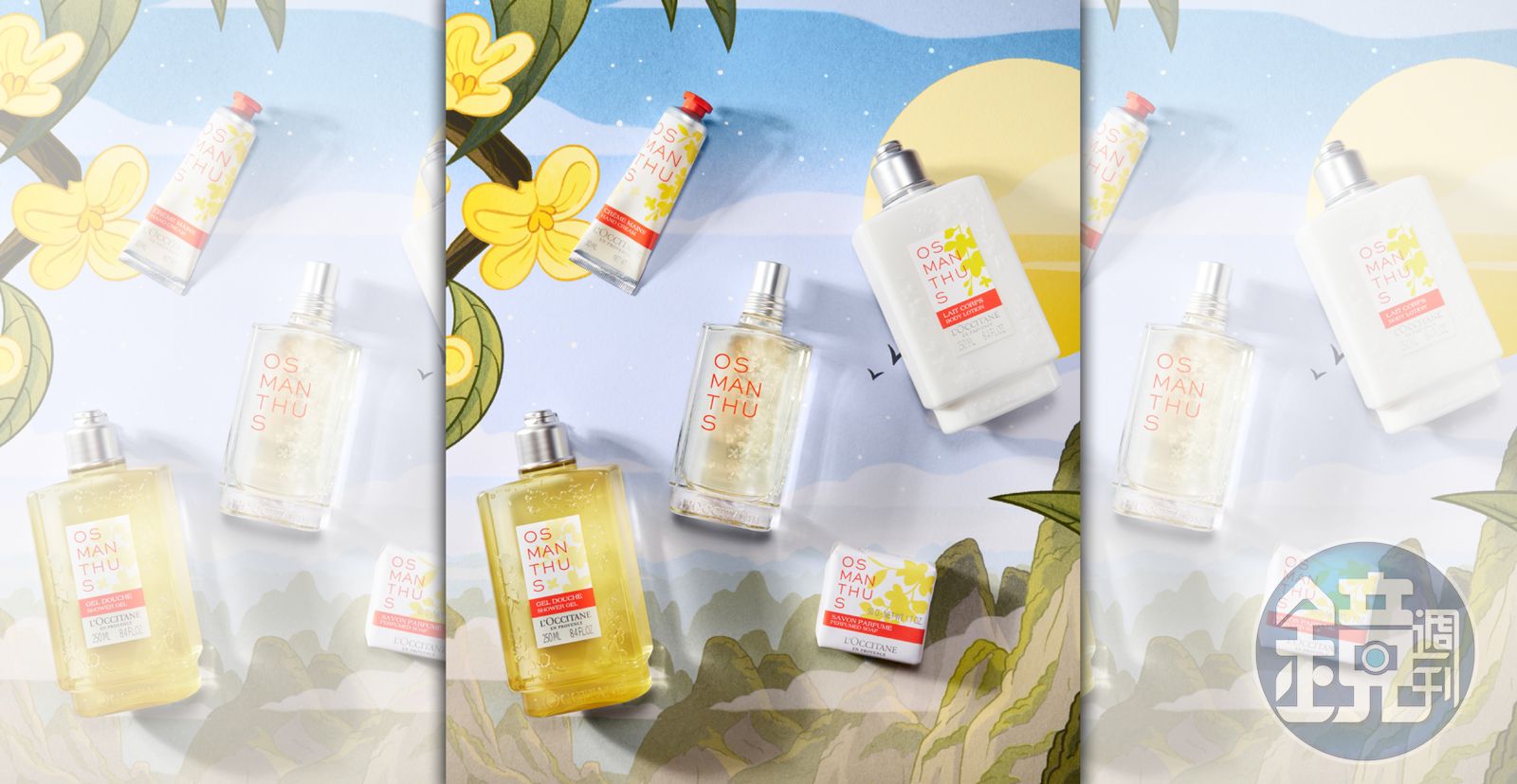 這個系列包括桂花淡香水、美體乳、沐浴膠、護手霜、滾珠淡香水與香氛皂。在香氣上做為中調,最後則以雪松與檀香收尾。美體乳則是以鈴蘭及小蒼蘭交織桂花,散發持久且細緻飽滿的香氣,與沐浴膠都使使用50%回收塑膠製成的包裝瓶,且可再次重複回收。