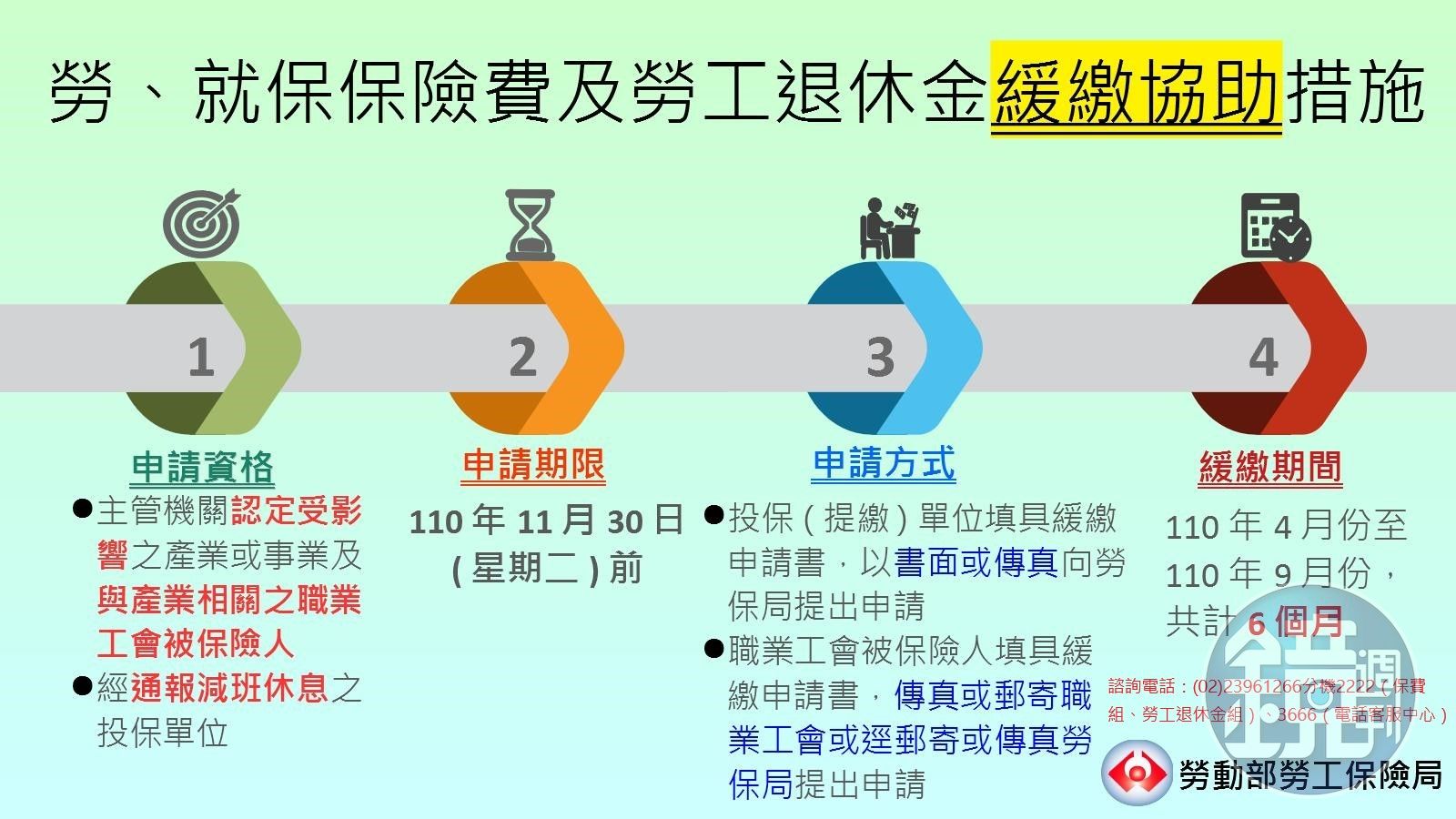由於受疫情影響者眾,勞投局推出勞保、就業保險、勞退金的緩繳政策,投保單位辦理緩繳的申請期間,自5月28日起至11月30日止。不過,勞保局也提醒,辦理緩繳前已繳納的保險費不可以改緩繳。