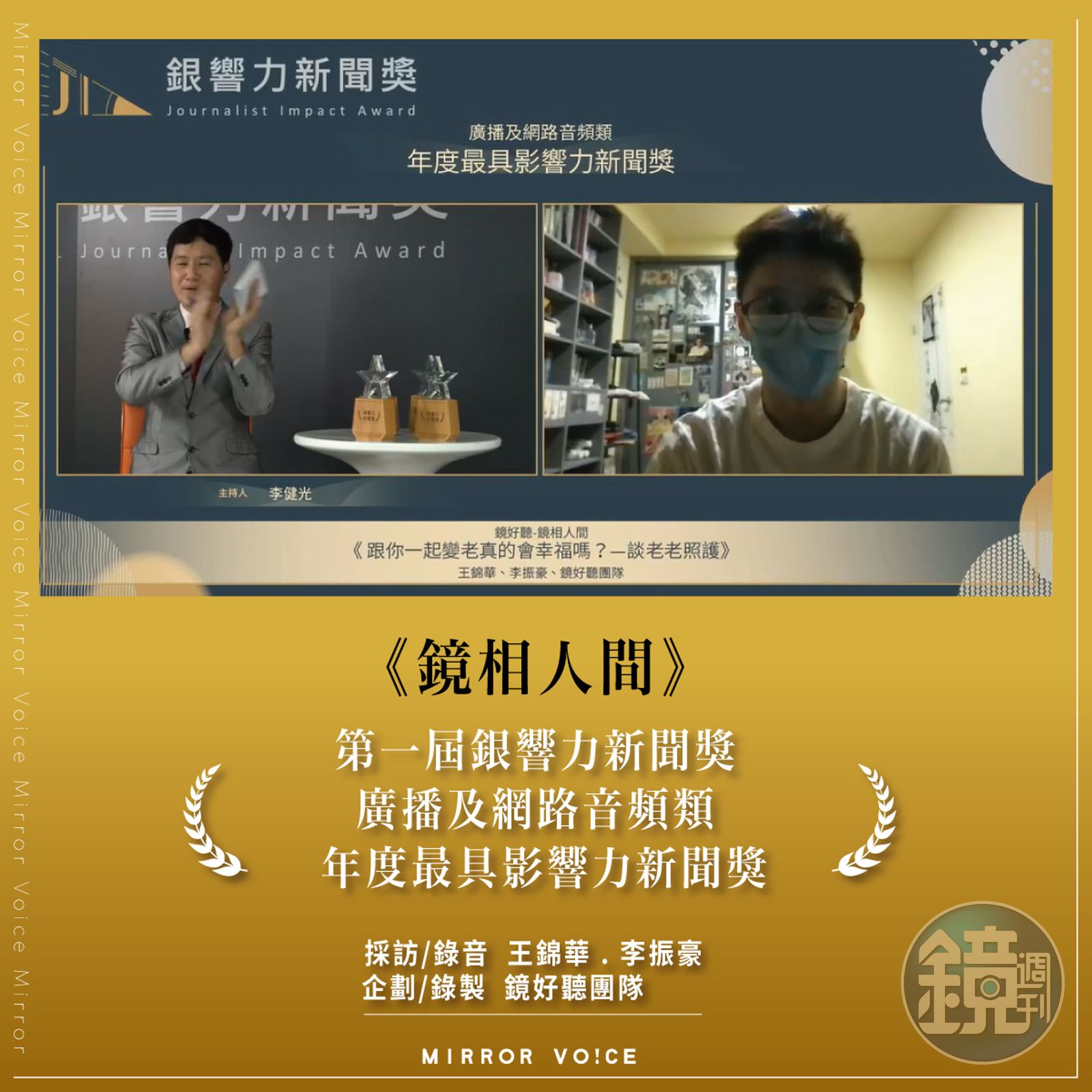 此次獲得第一屆JIA銀響力新聞獎-廣播及網路音頻類【年度最具影響力新聞獎】,主辦單位認為老老照護壓力引發的社會悲劇時有所聞,此專題直接顛覆挑戰「一起幸福到老」的觀念, 題材相當有吸引力;此外,專題內容也提出「聰明照顧」就是學會有效運用長照服務,才能讓受照顧者與照顧者都能生活的更有品質,相當有實用性。