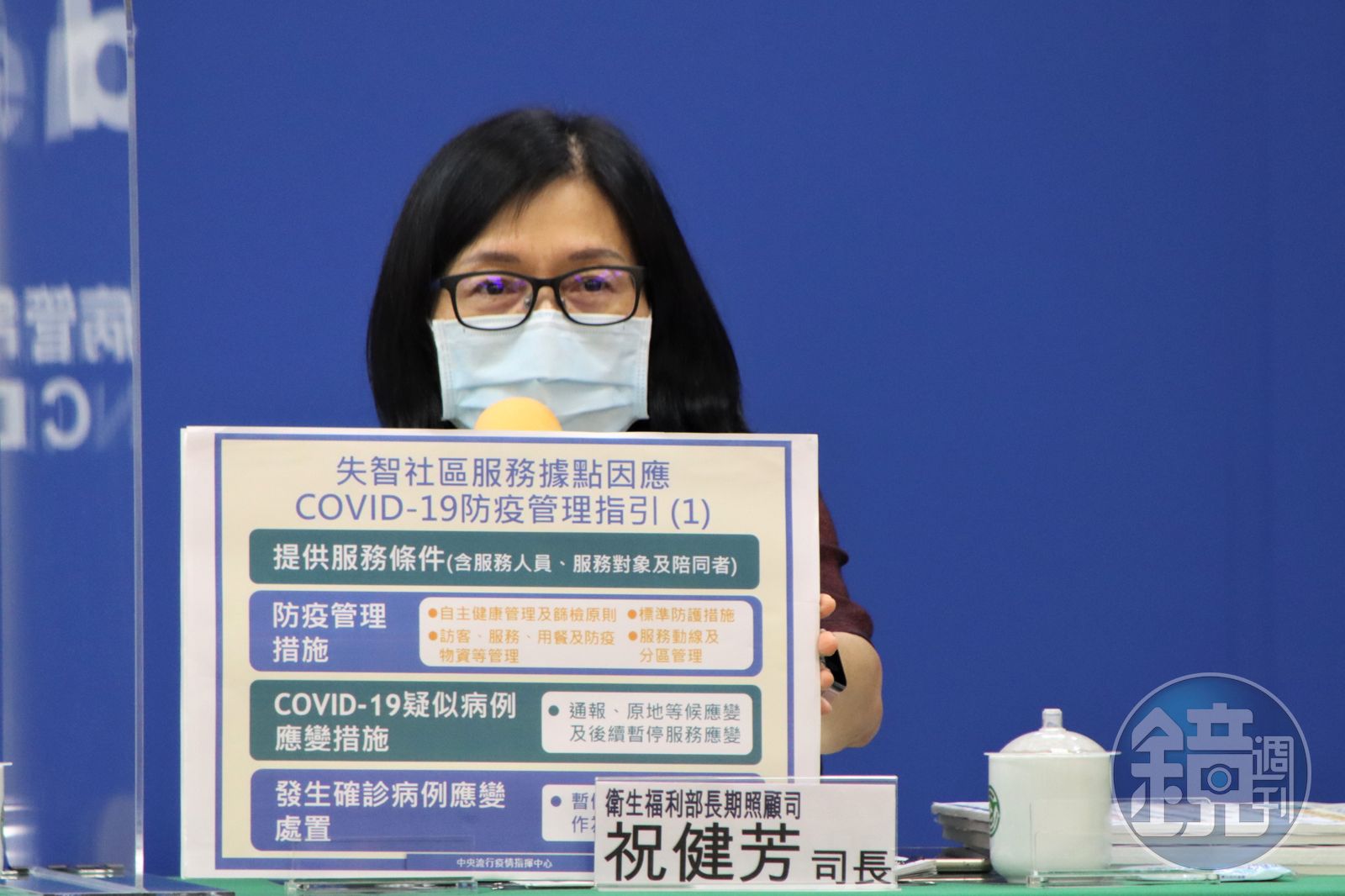 衛福部長照司司長祝建芳指出,相關指引分為「提供服務條件、防疫管理措施、疑似病例應變措施、發生確診個案應變處置」四大部分,而指揮中心也提供了防疫一級至三級的指引規範。