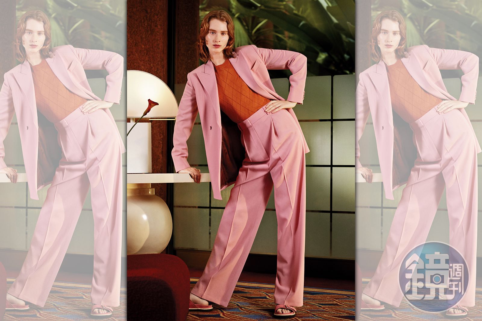 粉色西裝外套,價格店洽、紅色針織上衣,價格店洽、粉色西裝褲,價格店洽、粉色涼拖鞋,價格店洽。(PAUL SMITH提供)發布時間:2021.07.29 09:58 臺北時間