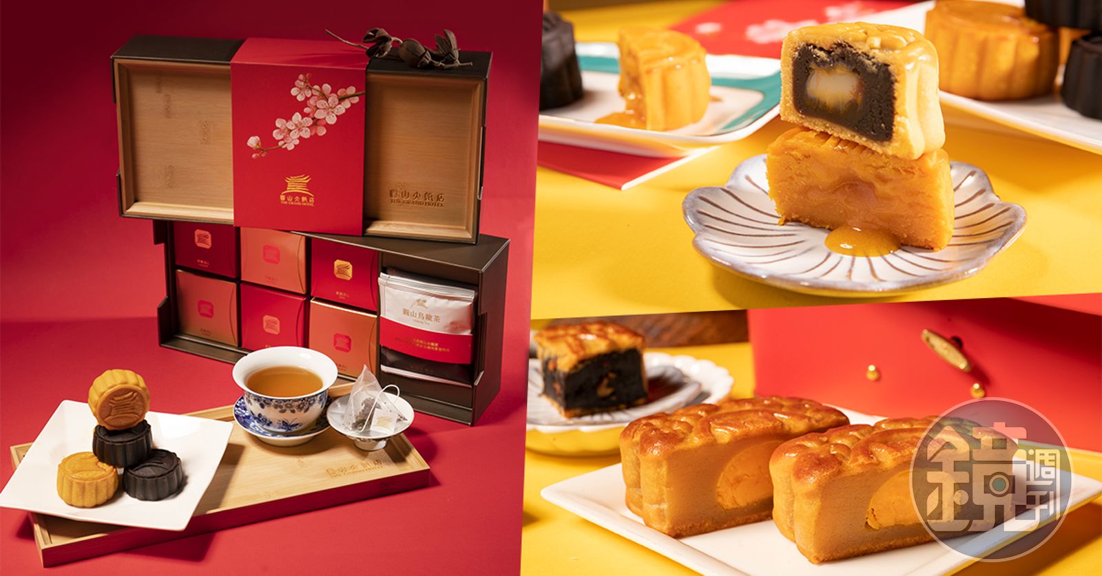 另一款「圓山茗茶玉盤月餅」設計高貴典雅,內含六入小巧精緻、口味創新的流心月餅,包覆在金、紅撞色的盒中,富貴尊榮。另搭配昔日蔣夫人宋美齡女士送禮及招待賓客必備的永安烏龍茶,口感回甘帶蜜,佐月餅能相互提升口感層次。值得一提的是,此限量版禮盒的上蓋,是雷刻圓山大飯店商標的竹木托盤,讓禮盒更有溫度、實用性及紀念收藏價值。