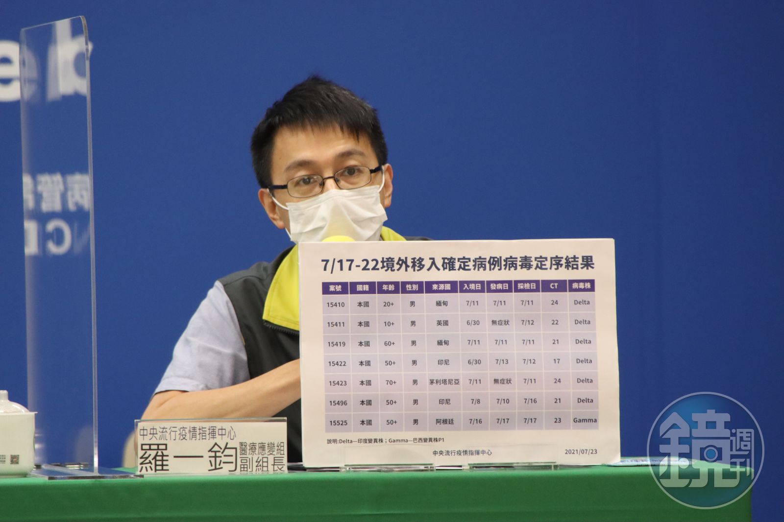 羅一鈞今在記者會上宣布最新基因定序結果,檢測時間為7月17日至7月22日,境外移入個案中驗出7個定序結果,其中6個為Delta變異株、1個則為Gamma。