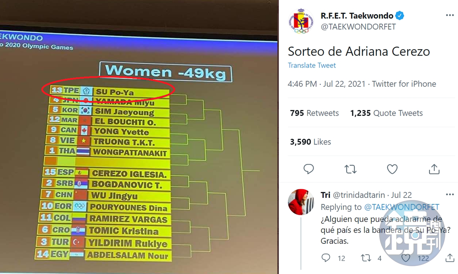 在西語圈掀起話題的台灣好手是跆拳道女子組49公斤級的選手蘇柏亞,近日西班牙皇家跆拳道聯盟的官方推特分享了該組賽事的抽籤結果,本來只是要和轉發西班牙選手瑟雷左(Adriana Cerezo)的出賽順序,沒想到名字出現在第一個的中華台北選手蘇柏亞吸引了西班牙網友的注意。