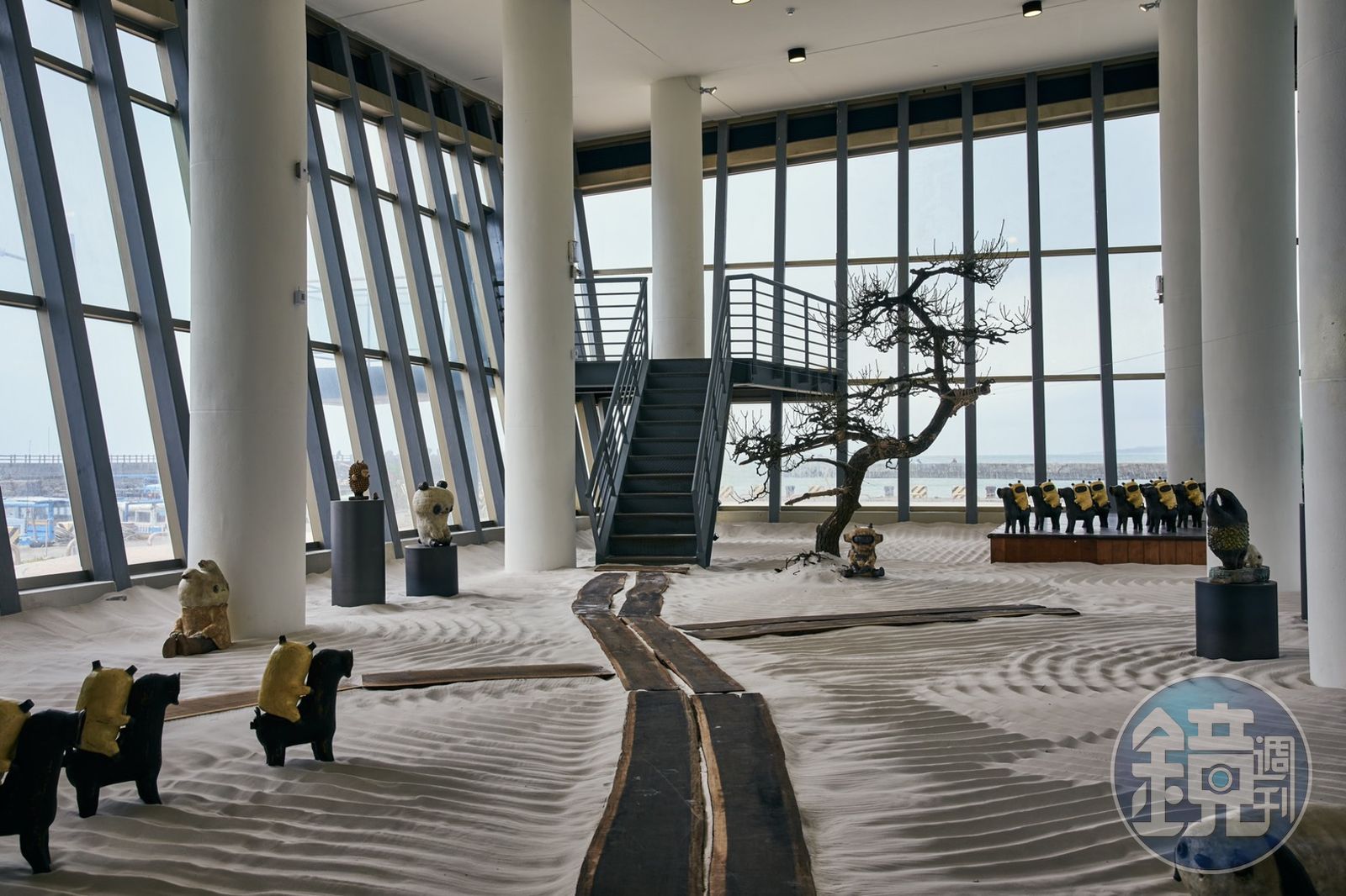 看海美術館首檔展覽與台灣當代藝術家─阿咧合作,以「春江怪獸」為主角,在藝術家的創作想像中,它來自海底,在一個花好月圓之夜背上行囊,浮出海面來到屏東海口,雙手攀附環抱美術館站立,好奇探頭想知道美術館屋頂有什麼,若想見怪獸萌臉,屋頂吹風看海廊道是唯一地方。