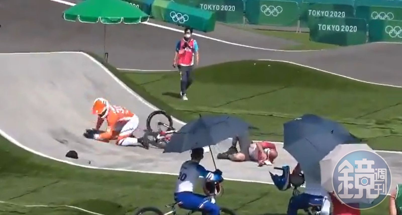 日本東京奧運再出包,荷蘭BMX小輪車競速賽選手尼克(Niek Kimmann)昨(26日)為週四(29日)比賽做準備,於有明都市運動公園的賽道進行練習時,與另一位選手疾駛於賽道上時,未料,忽然有一人出現,且試圖想徒步穿越賽道,由於選手處於全速衝刺狀態,雙雙來不及閃避,直接正面撞上該三寶男,選手則雙雙倒地翻滾一圈、擦傷。