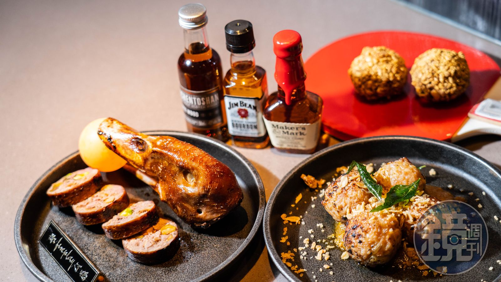 Nick負責前菜、主菜及甜點,前菜「Play Chicken Balls炭烤雞肉丸」,雞肉丸混合雞軟骨和洋蔥,在直火燒烤下,多汁焦香,搭配鹹蛋黃金沙醬,再沾裹以糖炒過的麥片,鹹香帶甜脆,加上新鮮咖哩葉,清新解膩。