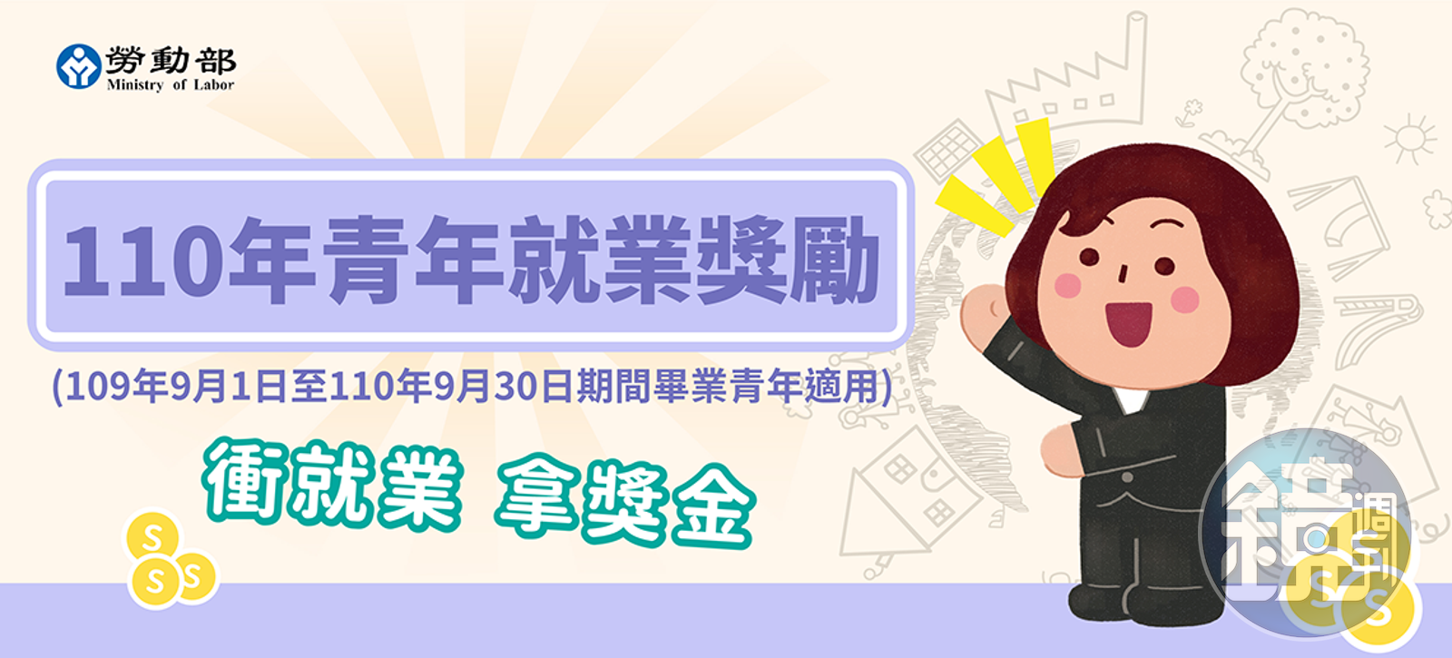 1.110年青年就業獎勵計劃:本國籍15~29歲、109年9月1日至110年9月30日期間畢業青年,只要到「台灣就業通」網站的計劃專區,線上登錄參加,找到工作最高提供3萬元就業獎勵。另外,為了協助畢業青年積極求職,提供交通補助、租屋補助等跨域就業津貼,畢業青年也可至各地就業中心洽詢。