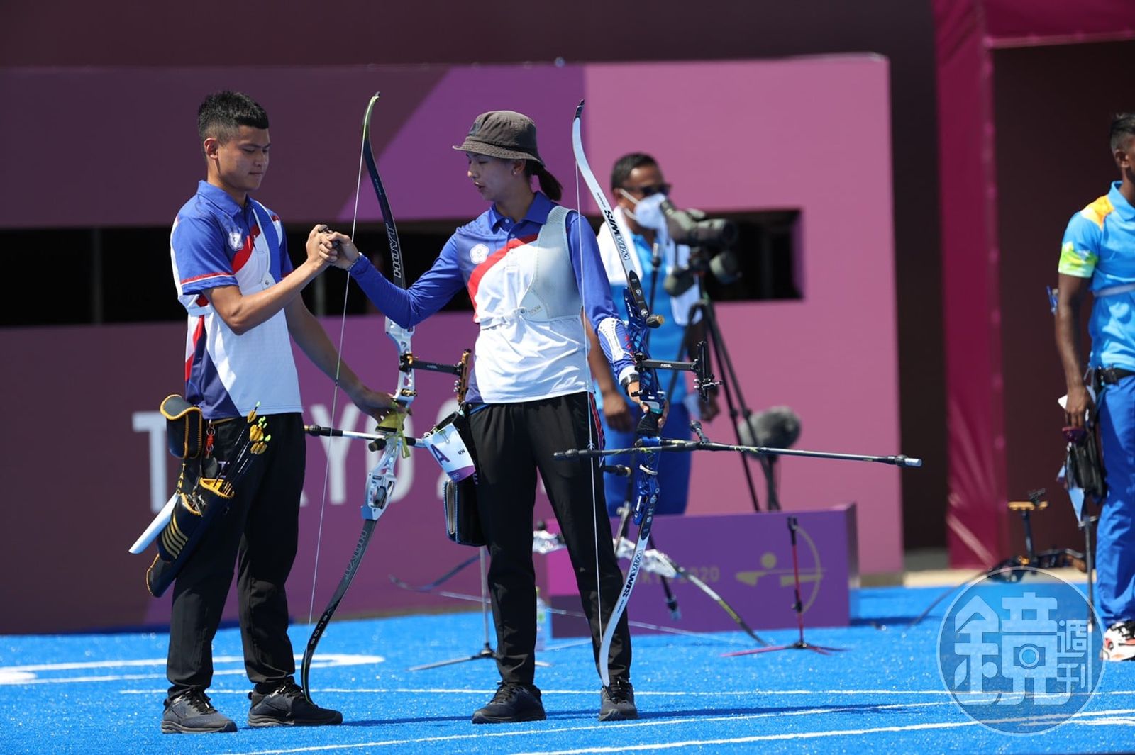 第一局,林佳恩先行發射,第一支箭射中8分,帕納特也同樣射到8分;第二支箭林佳恩再射8分,帕納特則射到9分;第三支箭林家恩再度射下8分,帕納特穩穩射下9分,最終以26比24先拿下2積點。