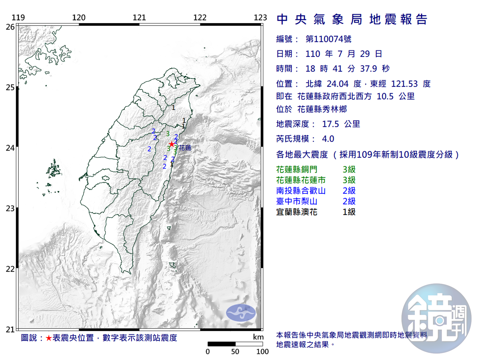 根據中央氣象局最新資料顯示,晚間18時41分左右發生芮氏規模4.0地震,震央在北緯24.04度,東經121.53度、花蓮縣政府西北西方10.5公里,位於花蓮縣秀林鄉,地震深度僅17.5公里。 最大震度位於花蓮縣達3級,南投縣、台中市地區最達震度達2級,宜蘭縣地區最大震度為1級。