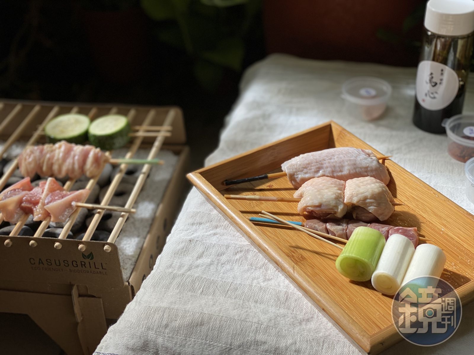 香甜的白肝慕斯抹上長棍麵包,橙醋淋上Q脆爽口的雞皮作為消暑開胃菜,串得工整且貼上標籤色紙的部位一字排開,別心慌,有2大張「給大廚的指南」可導航。先在通風的陽台組裝環保烤爐,燒熱四角的竹炭塊後,透過互相導熱也不用死命煽,沒有明火也能優雅烤出炭香。12串食材分5個回合來烤,原則就是瘦的和肥的部位交錯搭配,從鹽烤淡味到醬濃味重的,且不要貪心一次擺滿。撒鹽時必須與食材保持15~20公分的距離,原來撒鹽哥不是在搞笑,而是為了讓燒鳥能包覆炭香和均勻上鹽,光是這點訣竅學起來,就有幾分職人樣。
