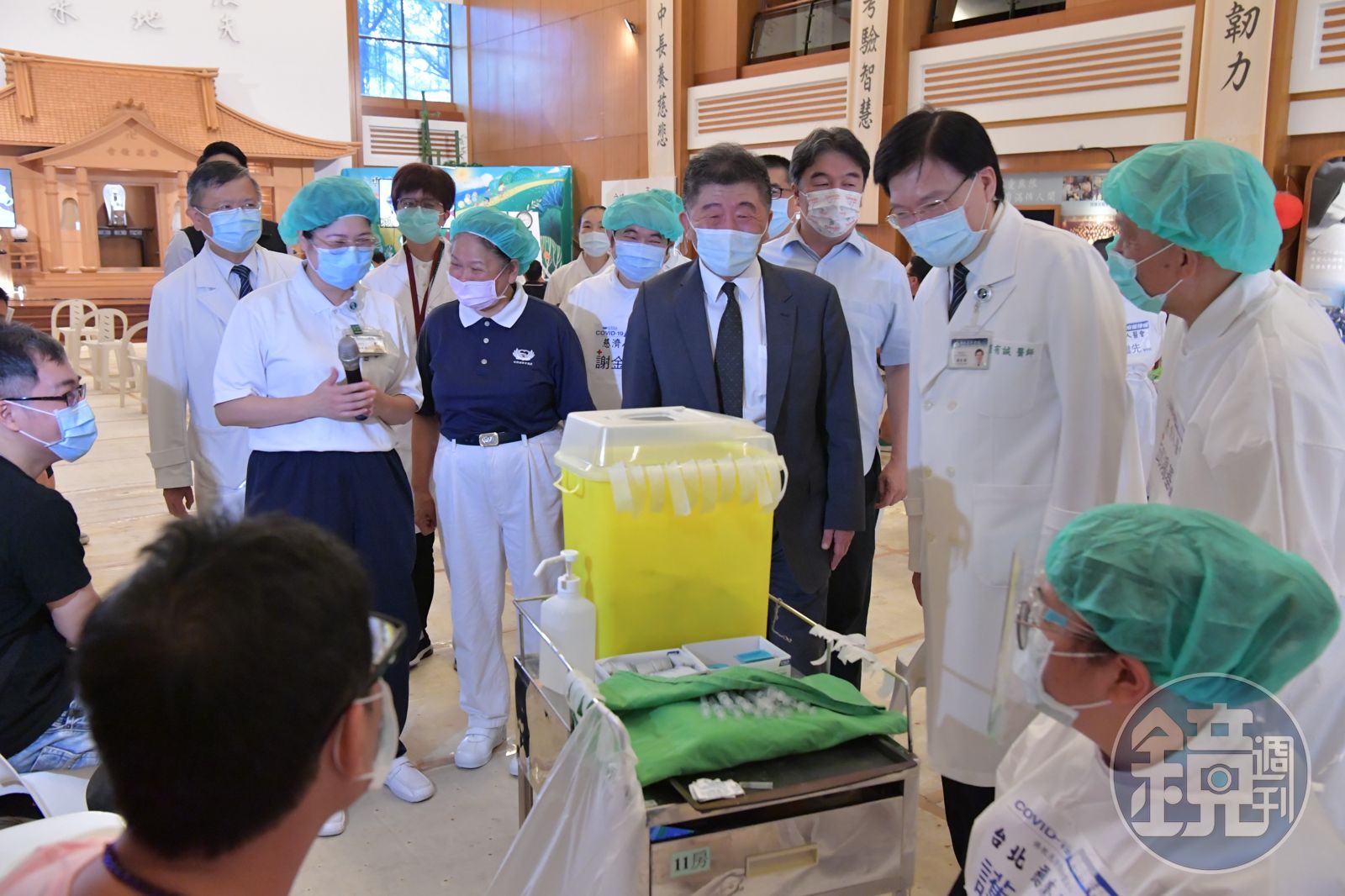 新冠疫情爆發後,位於新北市的台北慈濟醫院,除承擔起收治大台北地區最多確診病患醫治的醫院外,更承擔包括新店、板橋、三重、雙和、蘆洲等五處靜思堂施打疫苗業務。陳時中部長及王必勝執行長,在台北慈濟醫院趙有誠院長陪同下,抵達位於三重靜思堂的疫苗施打場地,三重資深慈濟志工羅美珠分享指出,為服務施打疫苗民眾免受悶熱與淋雨問題,各地靜思堂疫苗施打站不是只是單純出借場地而已,而是多了讓會眾大德到靜思堂進行疫苗施打時能自在安心。