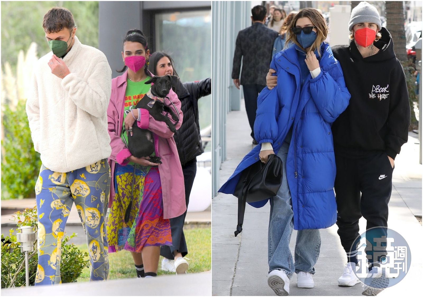 Justin Bieber與Hailey Bieber逛大街時的口罩是什麼?Justin Bieber一身黑色休閒運動服配上紅色口罩,高點又顯眼;倒是身旁的老婆Hailey以同色控概念,從口罩到長大衣、牛仔褲都是海藍色一片。Dua Lipa一身鮮亮色的服裝以及桃色口罩,充滿活力感,男友Anwar Hadid則以沈穩軍綠色口罩戴在臉上。