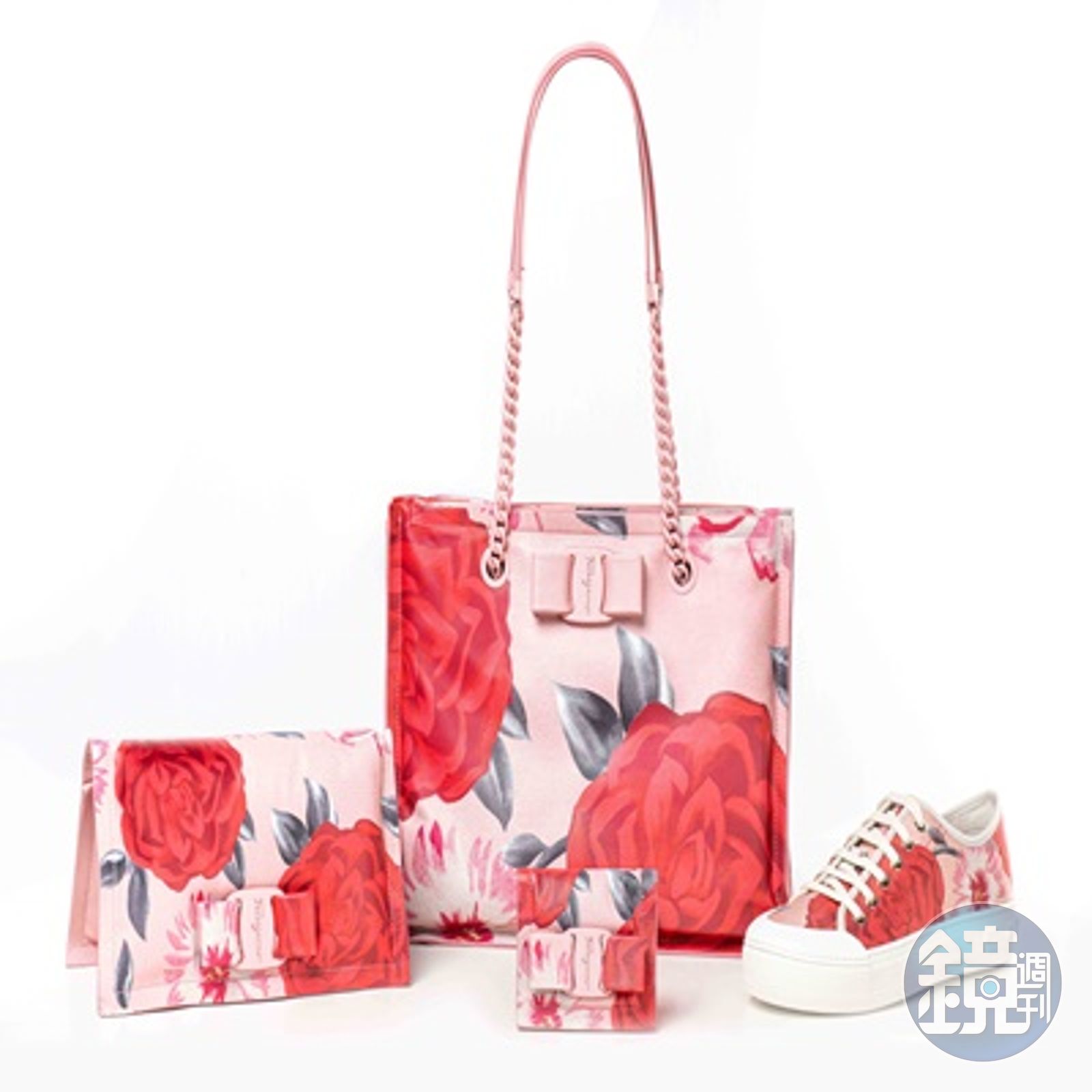 (前面中間起順時鐘方向)VIVA粉色印花小牛皮卡夾NT$19,900、迷你肩背包NT$39,900、托特包NT$79,900、REBEL粉色印花休閒鞋NT$25,900。(Salvatore Ferragamo 提供)發布時間:2021.08.02 10:26 臺北時間