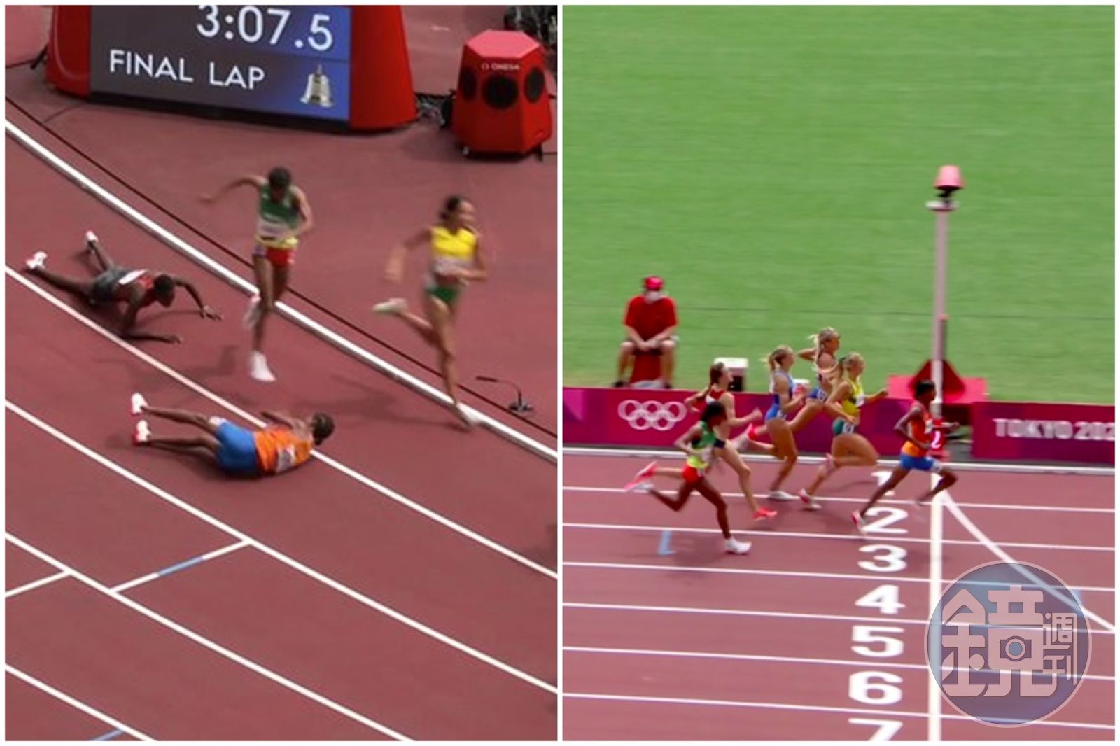 昨女子1,500公尺的預賽畫面中,各選手在進入最後一圈時,一名選手突然跌倒在地,讓緊追在後的跑者接連反應不及,紛紛撞在一起,其中荷蘭選手哈桑也遭絆倒、滾一圈跌坐在其他跑道上,正當大家以為完了的時候,哈桑與其他選手迅速敬業地爬起來繼續跑。