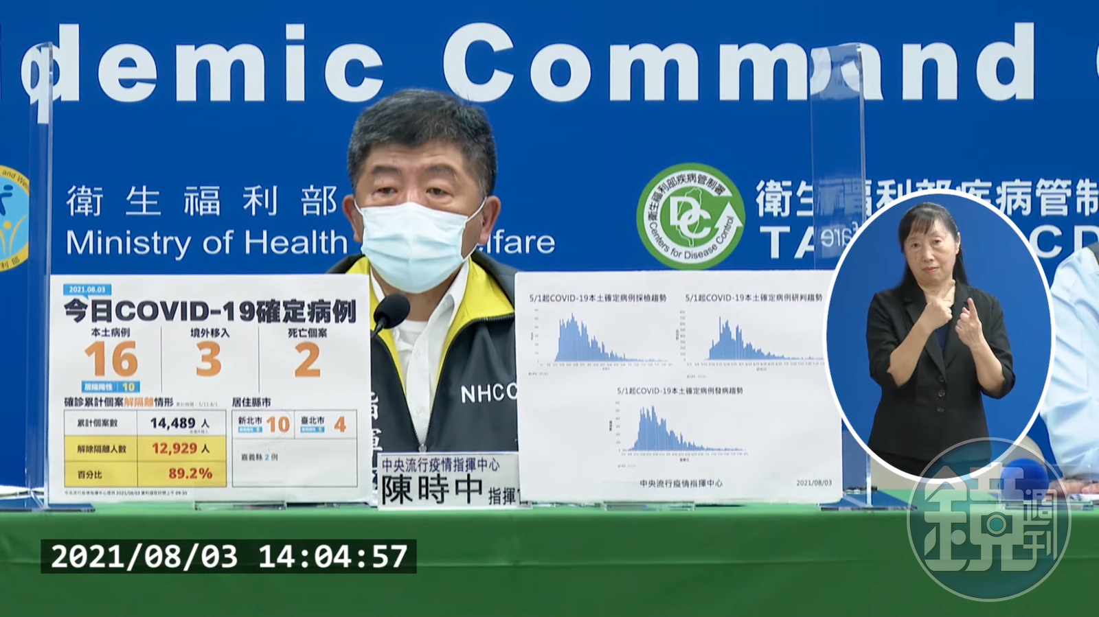 指揮中心指出,近期確診個案解隔離情形,5月11日至8月1日累計公布14,489位確診個案中,已有12,929人解除隔離,解隔離人數達確診人數89.2%。