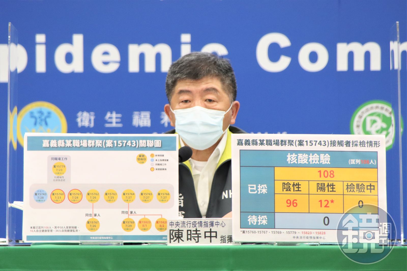 指揮中心說明嘉義某職場群聚情形。(指揮中心提供)陳時中指出,整體而言,該起事件共針對108人進行PCR採檢,其中96人陰性、12人確診,待採檢或檢驗中均為0人,上週六(7月31日)新增9處快篩點,其中4點做一天,另外4家醫院及1個篩檢站持續進行到本週六(7日),目前共檢驗1,604人,當中3人為陽性,但再經PCR檢驗為陰性。