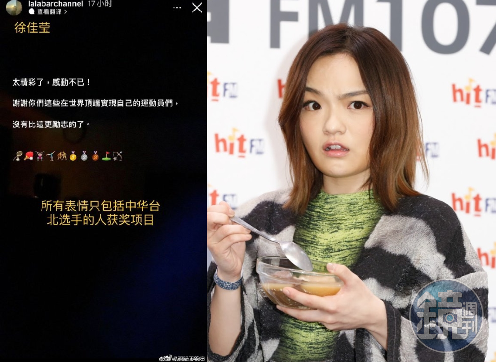 有中國網友發現,徐佳瑩在IG限時動態發文,寫道「太精彩了,感動不已!謝謝你們這些在世界頂端實現自己的運動員們,沒有比這更勵志的了。」並附上一連串的表情符號(Emoji),其中包含羽球、桌球、舉重、體操、柔道、高爾夫、射箭,以及金銀銅牌的圖案。