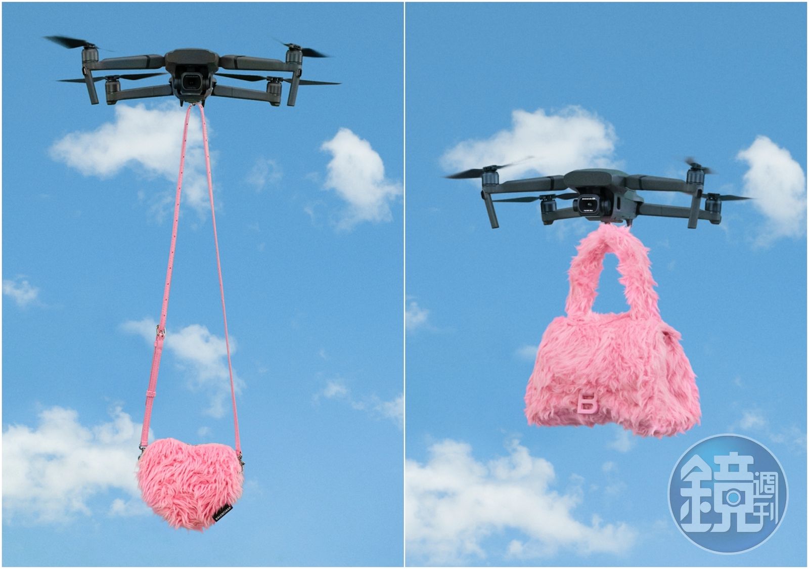 BALENCIAGA 2021七夕系列大片中,以科技的無人機為愛人送上七夕禮物。(左起)心型仿毛手拿包NT$28,700、仿毛沙漏包NT$57,500。(BALENCIAGA提供)發布時間:2021.08.03 10:13 臺北時間