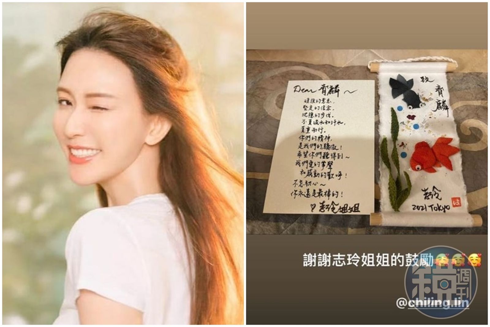 王齊麟昨更新限時動態,開心表示自己也收到禮物了,從PO出的照片可看出信紙旁擺了一幅掛旗,上頭有1黑1紅的立體金魚圖案,在日本具有「好運」「繁榮」「吉祥」等意義,信上林志玲親手用毛筆寫下「不負淚水和汗水,負重而行。你們的精神,是我們的驕傲!希望你們聽得到~我們愛的掌聲和感動的歡呼,不忘初心~你永遠是最棒的」,並壓上「2021 Tokyo」和簽名作為紀念。