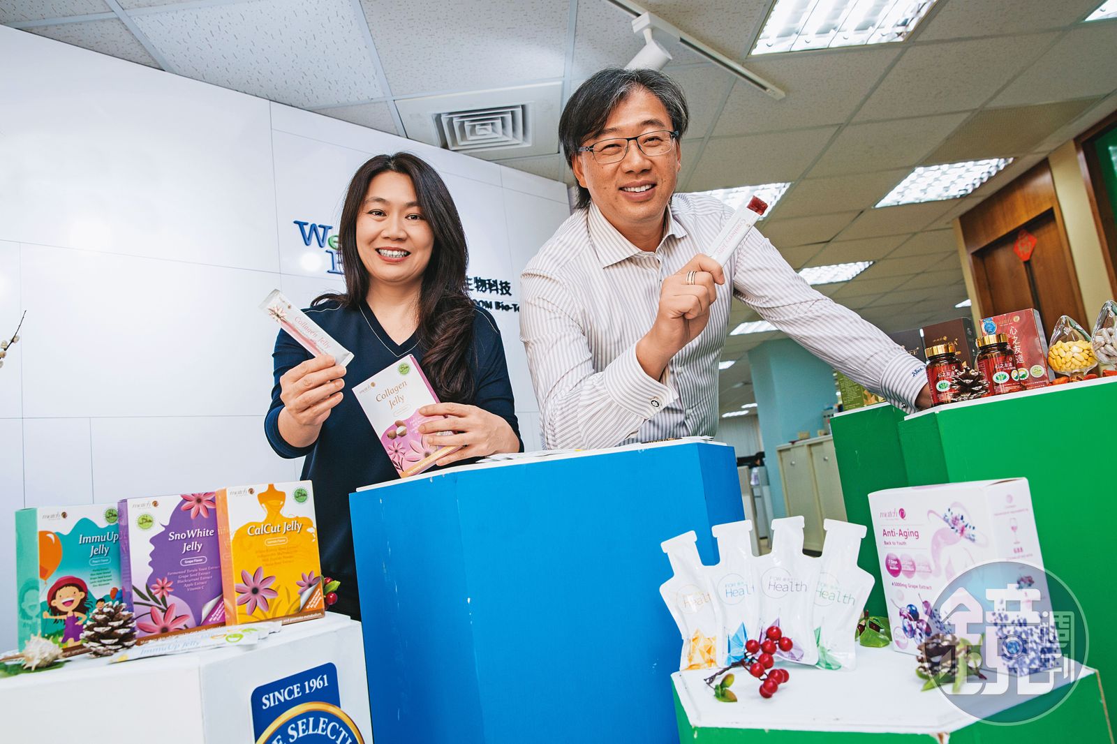 為發掘新藍海,夫妻倆經常飛海外看展,吸取醫藥與保健品最新資訊與趨勢,2008年在日本第一次嘗到果凍劑型保健品,讓一向不愛吞藥丸錠劑的王秋月大為驚豔,「一小條果凍單包裝能賣日幣500元(約新台幣130元),市場潛力驚人,台日交流這麼密切,本以為很快在國內就會看到類似產品,或許是卡在關稅問題,半年後我們發現市場上還沒人做,決定跳下來試試看。」