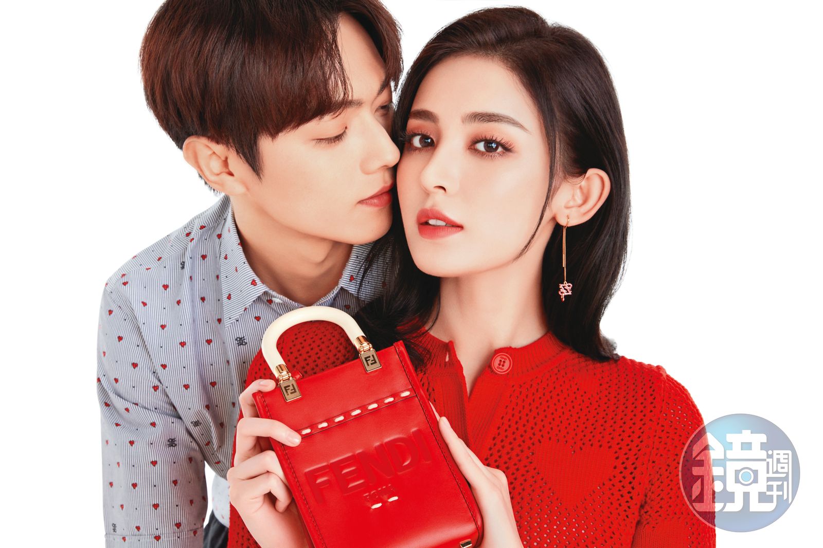 FENDI邀請中國演員許凱(左)與娜札共同演繹2021七夕限定系列廣告大片。娜札身穿紅色愛心圖騰針織衫NT$37,500、Sunshine Shopper(迷你)包款NT$52,000(FENDI提供)發布時間:2021.08.13 09:58 臺北時間