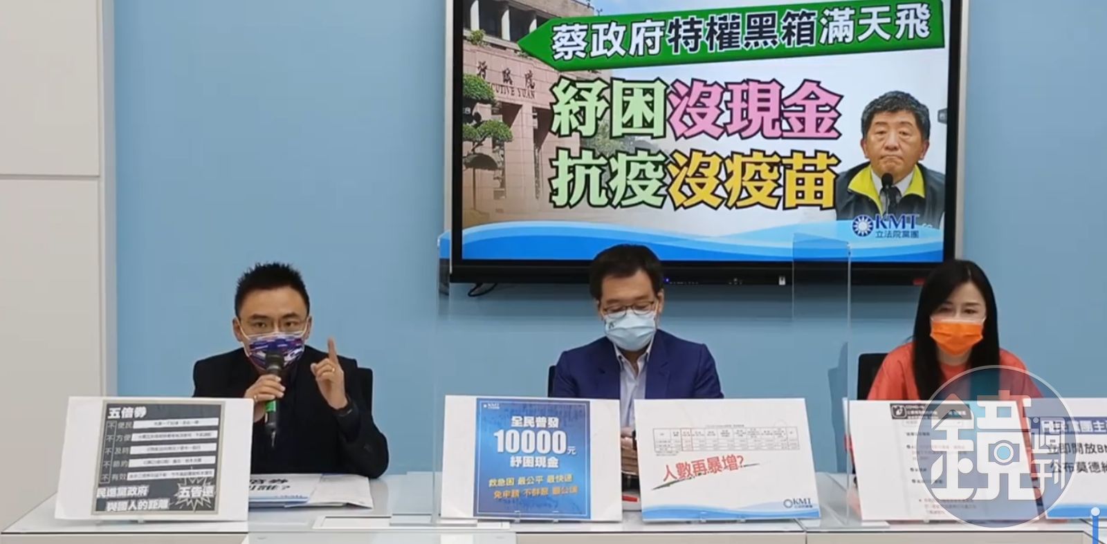 行政院預計最快9月推出振興五倍券,主張普發現金的國民黨對此大表不滿,藍營立院黨團今(6日)召開記者會,藍委萬美玲指出,她從各大民調來看,至少96%的民眾都希望發現金,但蔡政府堅持發五倍券,背離民意,質疑難道是為了內閣改組製造理由;她也痛批,去年發三倍券花了512.6億,蘇貞昌院長說帶來1,000億經濟效益,「若真能帶來近2倍的經濟效益,今年花1,100億發五倍券,就可帶來2,000億效益,若真這麼神,未來每年發券就好」。