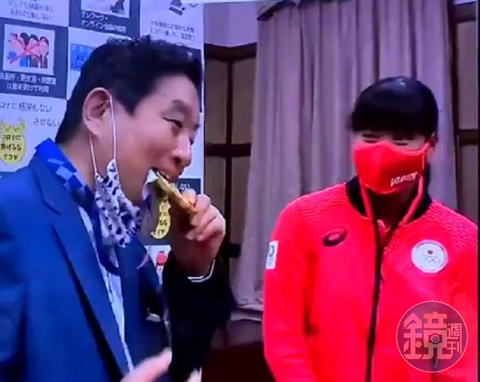 日媒報導,名古屋市長河村隆之接見奧運女子壘球金牌選手後藤希友,而後藤則將金牌象徵性的掛到市長脖子上,但金牌卻當場被市長拉下口罩咬一口。不僅引發網友反彈,奧運柔道金牌選手高藤直壽也表示,如果換作是他發生這種事可能會哭,沒有生氣的後藤選手心胸太寬大了。