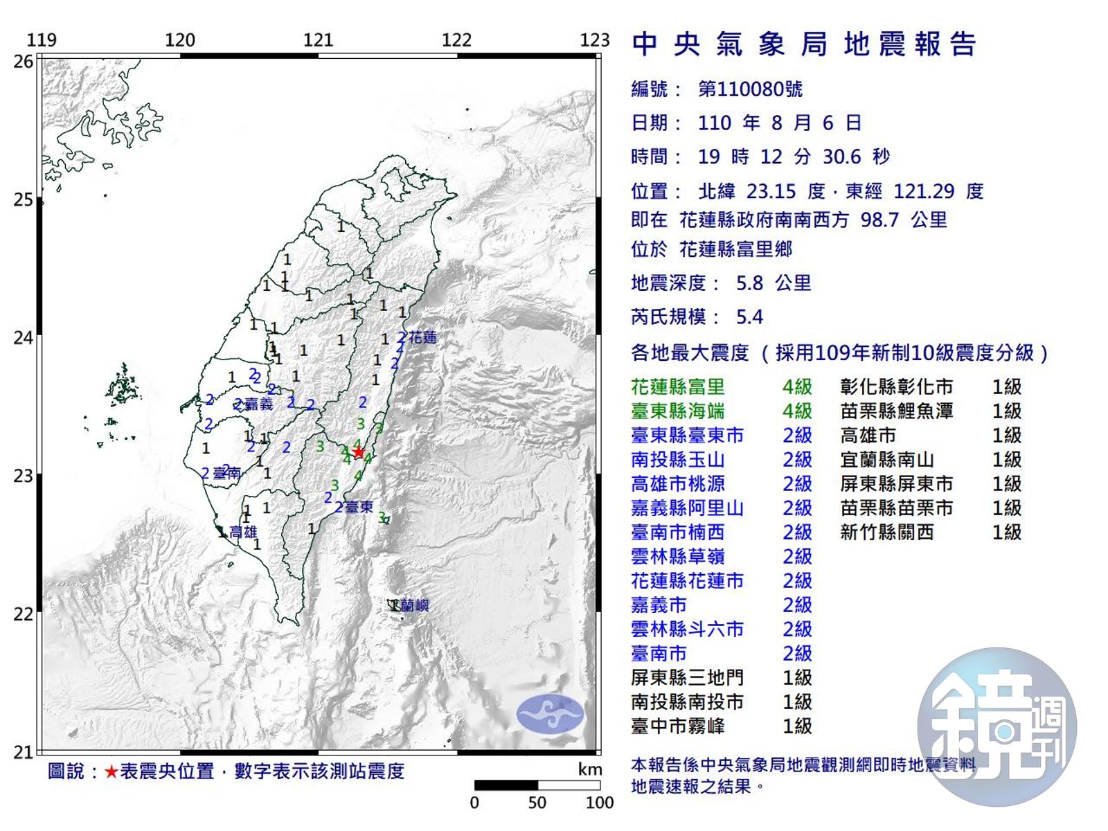 今日晚間7點12分花蓮富里鄉發生芮氏規模5.4、地震深度達5.8公里之有感地震,花蓮、台東最大震度達4級;南投縣、高雄市、嘉義縣、台南市、雲林縣、嘉義市的也有震度2級;屏東縣、台中市、彰化縣、苗栗縣、宜蘭縣、新竹縣則有1級。