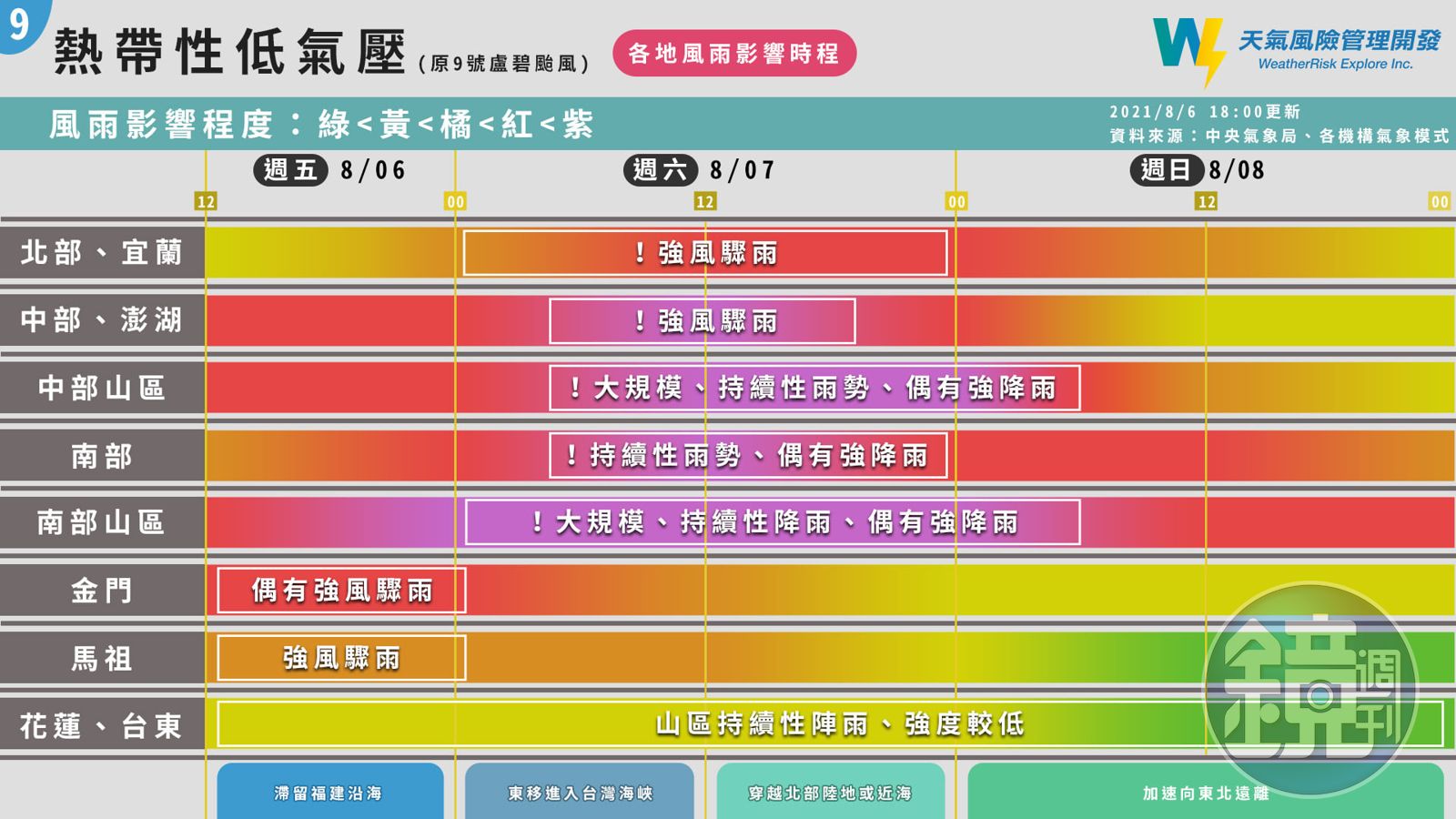 天氣風險公司製作各地風雨時程圖,橫軸上方是時間,即日起到週日,下方標註熱帶低壓的動態。縱軸則將台灣分為8個區域,分別描述各地、各時段的風雨影響程度。表中的顏色代表風雨影響程度,從大至小依序為紫色、紅色、橘色、黃色、綠色。