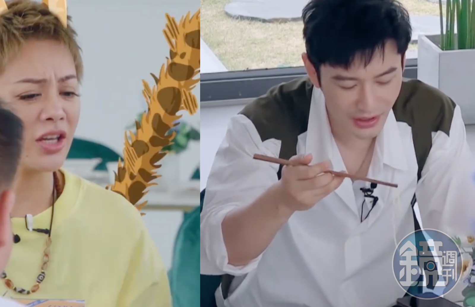 黃曉明這個吃得比女明星還少的舉動讓寧靜看不下去,開口訓黃曉明太誇張,拍桌子罵:「我告訴你,你有點作(做作)!」眼看氣氛搞得有點僵,黃曉明拿起筷子決定再吃一根,大姐頭作風的寧靜語氣放緩,說自己擔心黃曉明吃太少,到時沒體力做好餐廳店長的工作,「你把這些肉、青椒都吃一吃吧。」結果黃曉明又想出拒吃新招,說他長智齒牙疼。使寧靜再皺眉罵他哪來這麼多毛病。