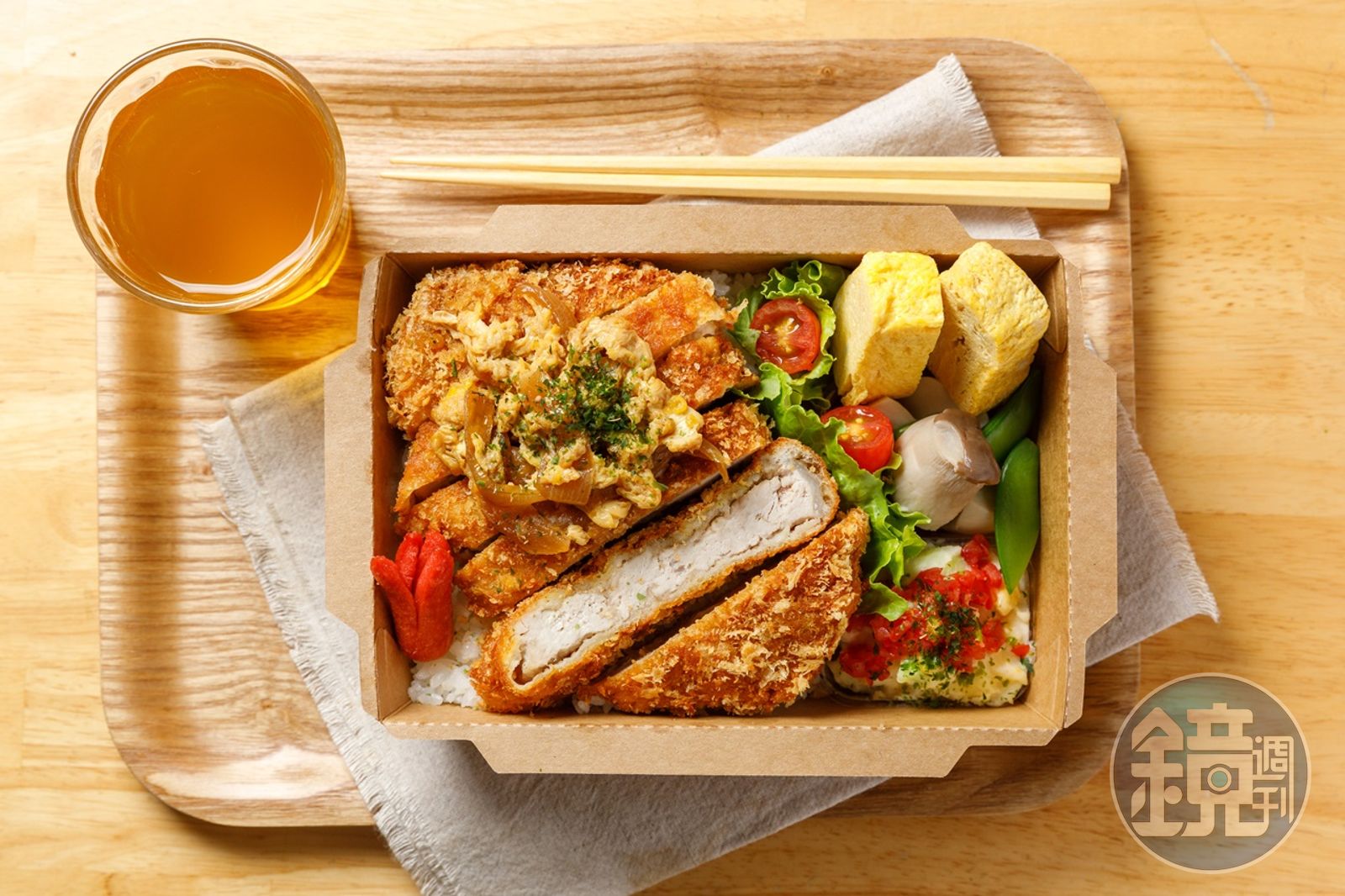 食量大的,可以挑戰「豬排愛玉子」。厚度超過1公分的豬里肌,裹上麵包粉炸到金黃後,放進親子丼醬汁裡燒煮,讓豬排吃起來厚實不柴,又吸附蛋汁香氣及洋蔥甜味。搭配馬鈴薯沙拉、胡麻醬時蔬和玉子燒,能變化口味、解油膩,整份吃完,已經飽到我的天靈蓋。