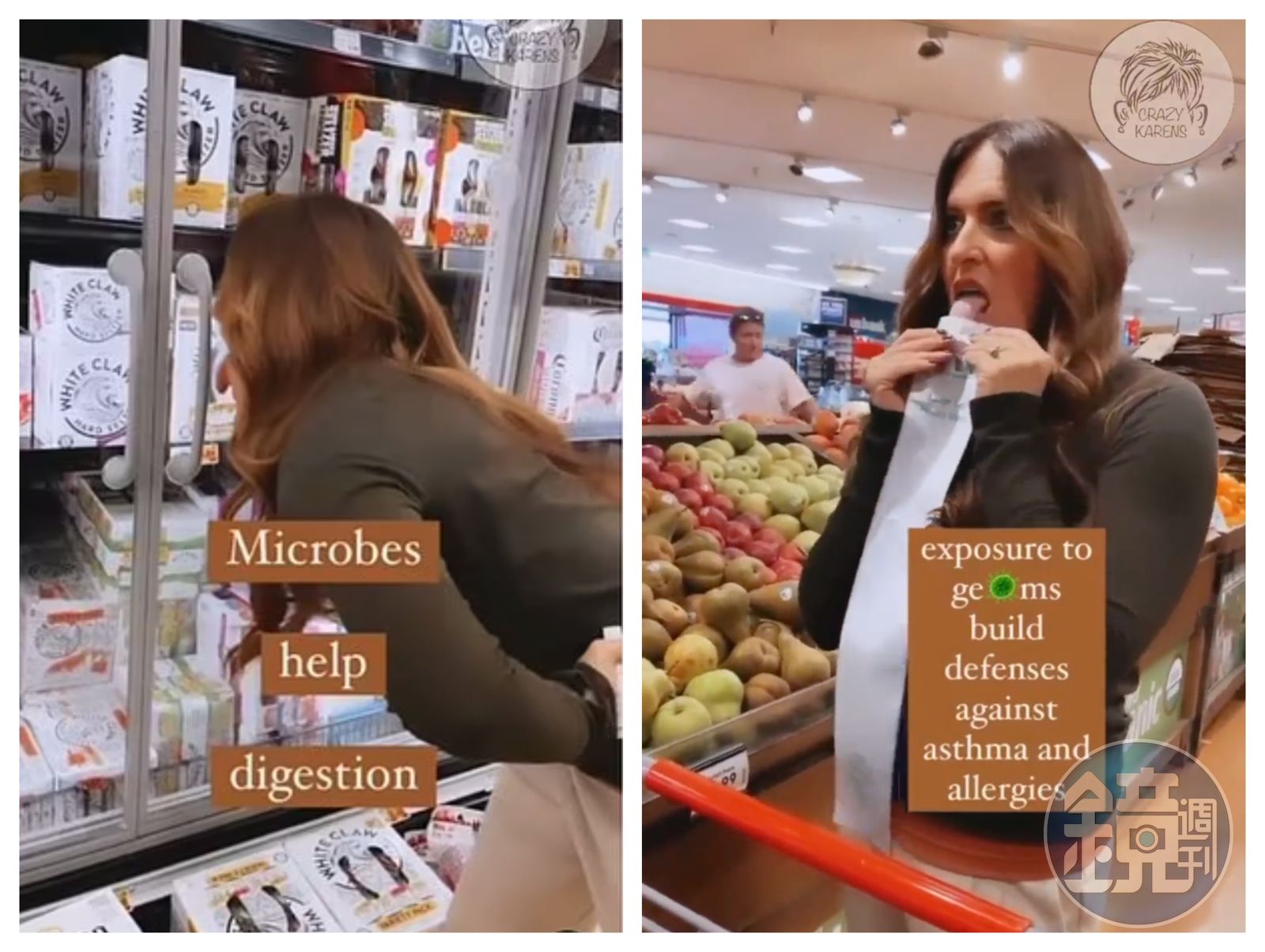 美國女子梅舒克(Jodie Meschuk)在IG擁有逾1.7萬追蹤,日前她帶著兒子到一家超市,接著「出動靈舌」舔遍所有東西,包括購物車、裝蔬果的塑膠袋、冰箱把手等。影片中她寫道:「細菌可以增強您的免疫系統。」這種完全錯誤的防疫觀念。