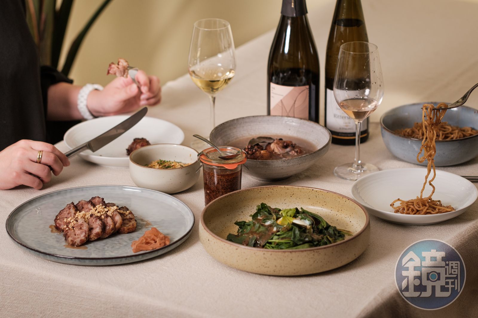 選酒與下酒菜的「款Hō酒」,則以「南洋沙嗲小腿」搭配在國外獲獎連連、台灣威石東酒莊所產「小威石東微氣泡酒 W°2」淡雅柑橘香氣與清爽柔順酸度,地酒配地食。