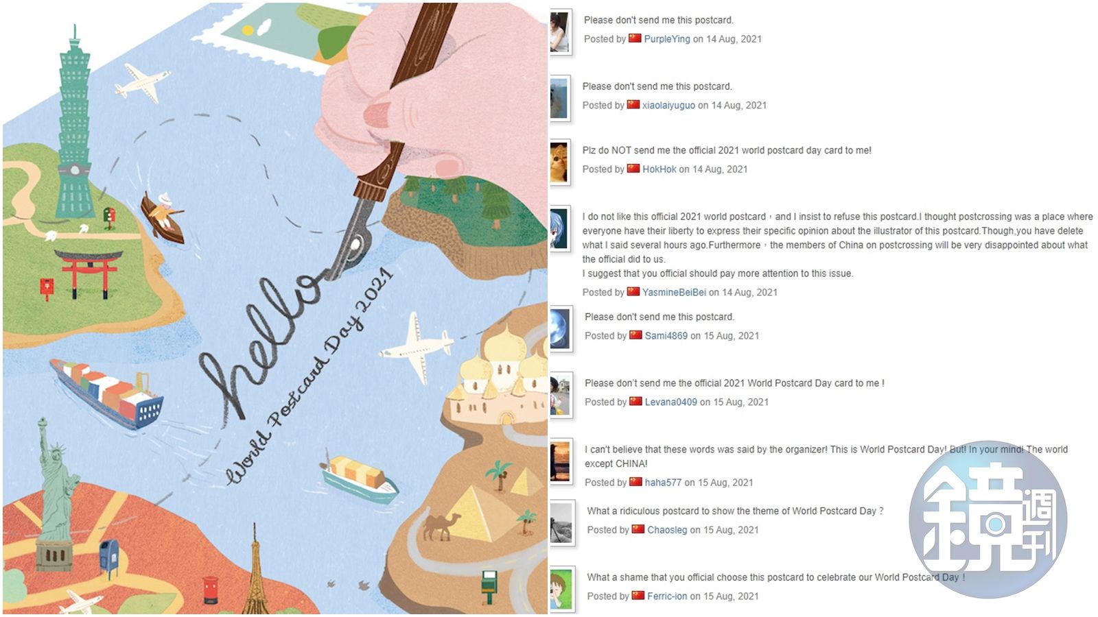 台灣插畫家「紹華」的作品被評選為第一卻惹怒中國小粉紅,紛紛在官方部落格上洗版留言。(翻攝自postcrossing部落格)