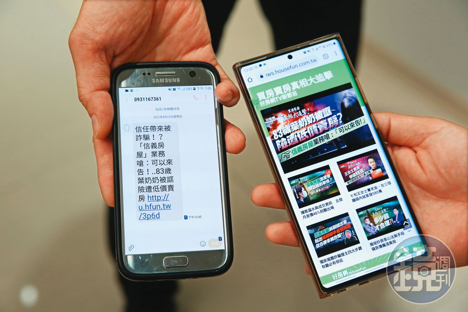 許多民眾近來都收到一則名為「信任帶來詐騙!?信義房屋業務嗆:可以來告!…83歲葉奶奶被誆險遭低價賣房」的簡訊,末尾還附上連結,點進去是永慶房屋旗下媒體「好房網TV」的YouTube頻道,內容經過整理、編排,全是信義房屋的負面新聞。