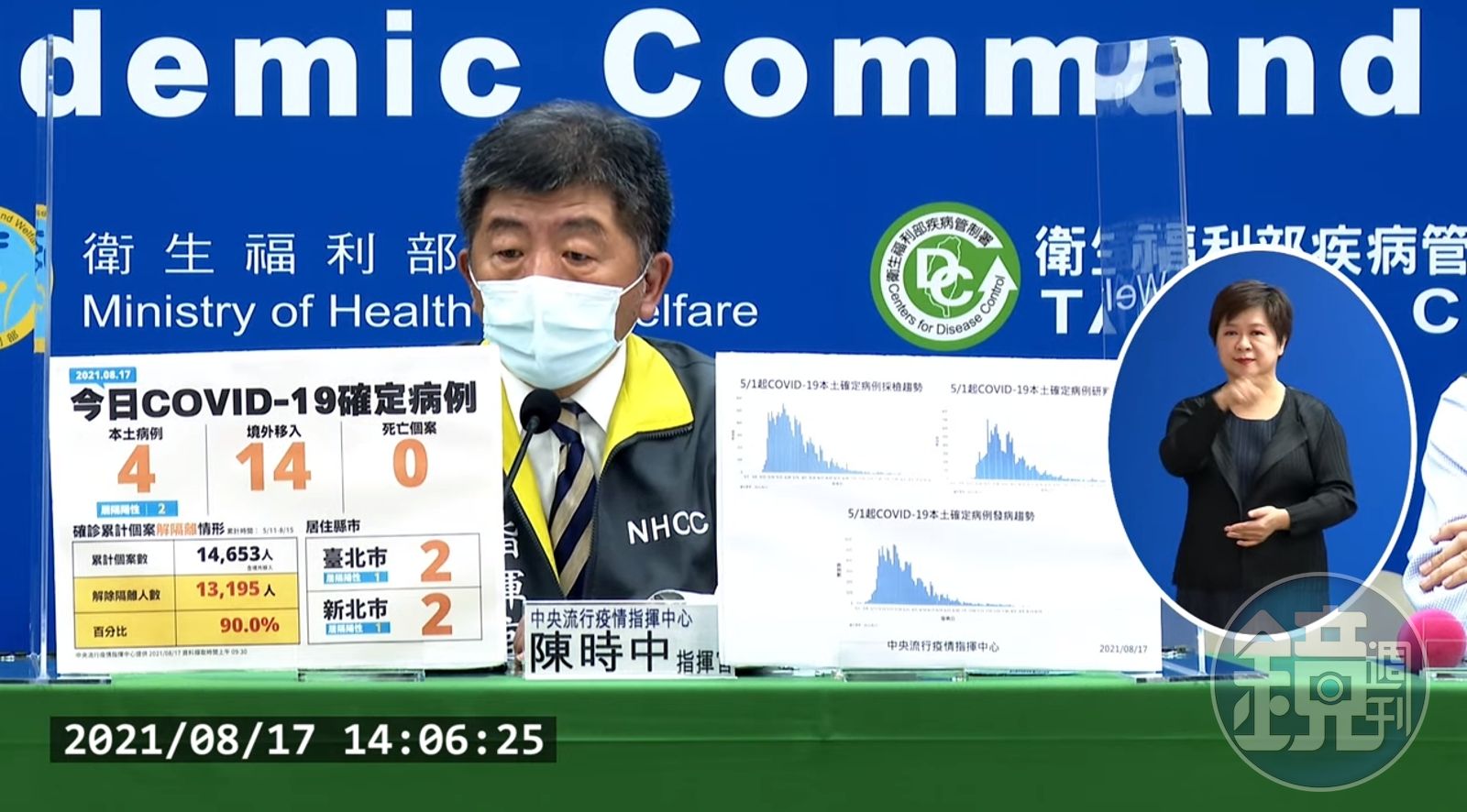指揮中心表示,今日新增之4例本土病例,為3例男性、1例女性,年齡介於未滿5歲至60多歲,發病日均為8月16日,個案分布為台北市、新北市各2例,其中2例為居家隔離期間陽性者;此外,今日新增之本土病例2例為已知感染源、2例疫調中。