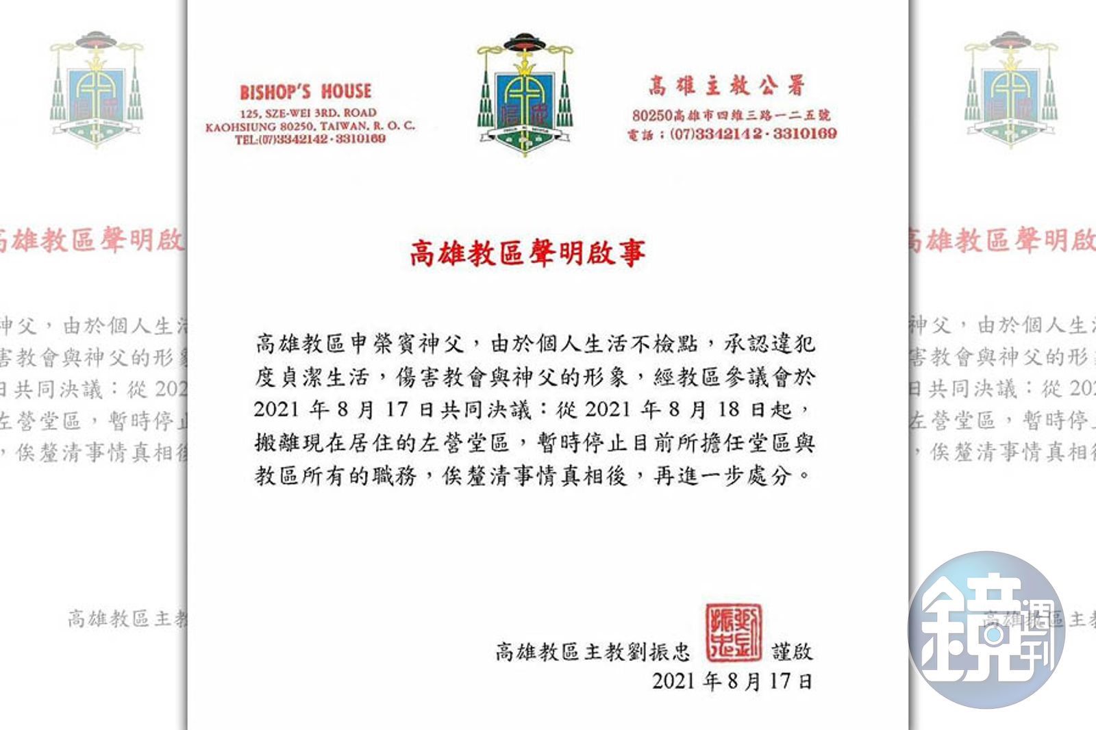 天主教高雄教區發出聲明啟事,「高雄教區申榮賓神父由於個人生活不檢點,,承認違犯度貞潔生活,傷害教會與神父的形象,經教區參議會於 2021年8月17日共同決議:從2021年8月18日起,搬離現在居住的左營堂區,暫時停止目前所擔任堂區與教區所有的職務,俟釐清事情真相後,再進一步處分。