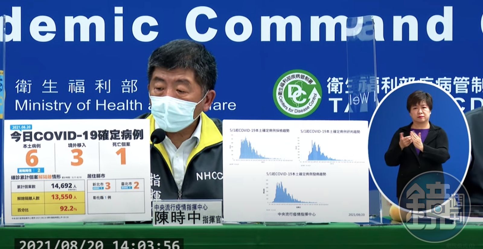 指揮中心指出,近期確診個案解隔離情形,5月11日至8月18日累計公布14,692位確診個案中,已有13,550人解除隔離,解隔離人數達確診人數92.2%。