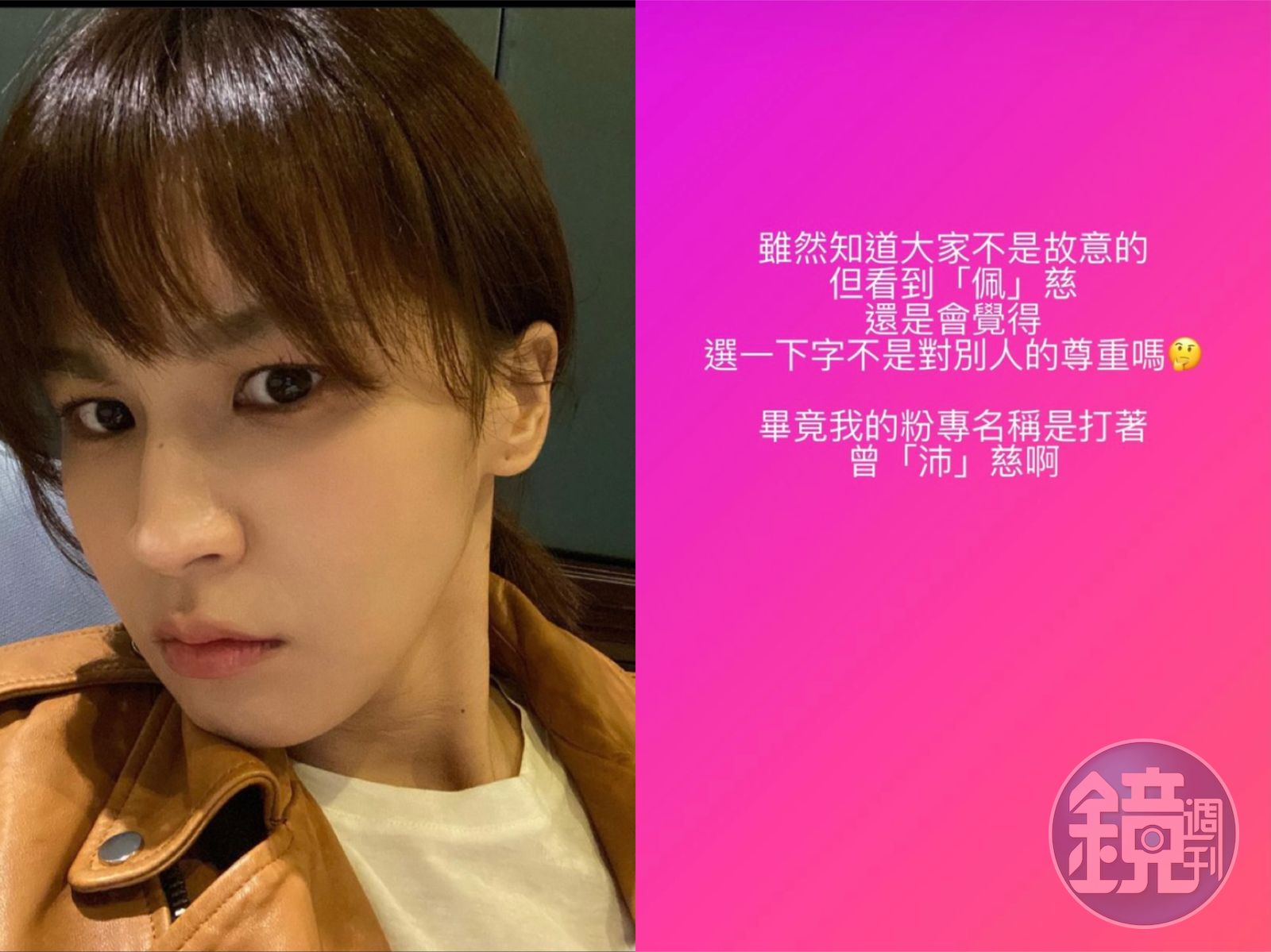 雖然曾沛慈知道粉絲不是故意的,但心裡還是有所困惑,不禁在限時動態發文,「知道大家不是故意的,但看到『佩』慈,還是會覺得…選一下字,不是對別人的尊重嗎?畢竟我的粉專名稱是打著曾『沛』慈啊!」看出她相當在意這件事;事後該粉絲留言道歉,並表示之後會更加注意。