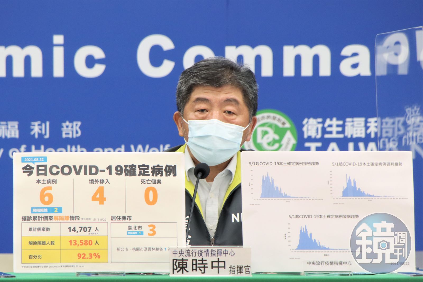 指揮中心表示,今天新增的6例本土病例(其中2例為居家隔離期間或期滿檢驗陽性者),為3例男性、3例女性,年齡介於未滿5歲至90多歲,其中1例發病日為8月21日、其餘5例為無症狀感染。個案分布為台北市3例,新北市、桃園市及雲林縣各1例;其中3例為已知感染源、1例關聯不明、2例疫調中,將持續進行疫情調查,以釐清感染源。