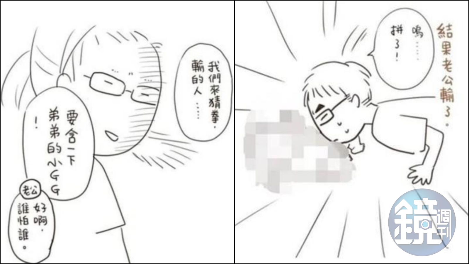 林姓漫畫家在臉書po出的圖文中敘述到,某天小嬰兒剛洗完澡,她覺得嬰兒「連小GG都好可愛」,接著和老公提議玩猜拳,「輸的人要含弟弟的小GG」,老公也答應了;隨後老公猜拳輸了,竟真的含住嬰兒的下體,聲稱「口感像粉腸」,接著林自己也跟著含住男嬰下體。